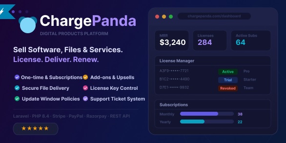 ChargePanda is a self-hosted PHP script built on Laravel that gives you a complete platform to sell digital products, downloads, subscriptions and licenses — all under your own domain, with zero platform fees on your revenue.